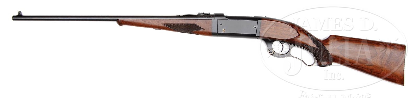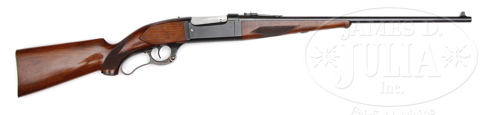 Please Note: This is an 1899-G Model. *SAVAGE 1899 SEMI-DELUXE TAKE DOWN LIGHTWEIGHT RIFLE W/CASE. SN 234976. CAL. 250/3000. 22″ lightweight brown bbl with correct sights, pistol grip A-grade checkered semi-deluxe stocks with shotgun style buttplate. Housed in a custom constructed brass bound leather trunk case with the monogram “RRR” tooled into the lid with staghorn handles. Very fine little gun in a pleasing case. PROVENANCE: Wes Adams Estate Collection. CONDITION: Overall gun is excellent with 98 plus % bright shiny original blue as well as vivid case colors on the lever, original stock is excellent as well sharp checkering and most of the original varnish. Very good bore. Case is sound with pleasing brass patina and aged leather. 4-44863 LM93 (1,500-2,000)