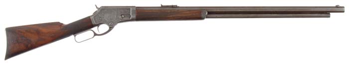 VERY RARE DELUXE ENGRAVED MARLIN MODEL 1881 LEVER ACTION RIFLE. Cal. 40-60. SN 10352. Consignor states that this rifle was owned & used by Floyd Marriott, a vigilante in the California gold fields in the 1880’s and 1890’s. Consignor states that Marriott was known to not have worn a hood during his vigilante activities and was later exiled to a foreign country in his old age, similar to what was done for Granville Stewart of Montana, also a famous vigilante. Model 1881 rifles are scarce to start out with, deluxe rifles are even more scarce and an engraved deluxe is the most scarce. This fine rifle has an additional feature of the very rare 30” extra heavy bbl with magazine tube 2” shorter than the bbl, from the factory. It has a modified Lyman hunting front sight, missing the ivory bead and a Winchester “1876” marked ladder rear sight. Mounted with very highly figured, early style checkered French walnut with straight stock & semi-crescent, smooth steel buttplate. Receiver is very nicely engraved, probably by L.D. Nimschke with vignette of a running elk on left side, a grizzly bear on right side and a tiny elk head on the top of bolt. Vignettes are all surrounded by very well executed foliate arabesque patterns with shaded background. Accompanied by a Cody Firearms Museum letter identifying this rifle in caliber 40-60 with 30” oct bbl, shipped March 31, 1885. CONDITION: About fine. No orig finish remains being a light gray/brown patina over all metal surfaces with scattered spots of light surface discoloration. Engraving is sharp & clear with good, fine detail remaining. Stock has a gouge out of comb with a long scratch over forearm with other light to moderate nicks & scratches showing moderate to heavy wear. Forearm is a smooth, hand worn patina while the buttstock retains 75-80% orig varnish. Mechanics are crisp, strong bright bore with some frosting in grooves. 4-30644 JR273 (10,000-15,000)