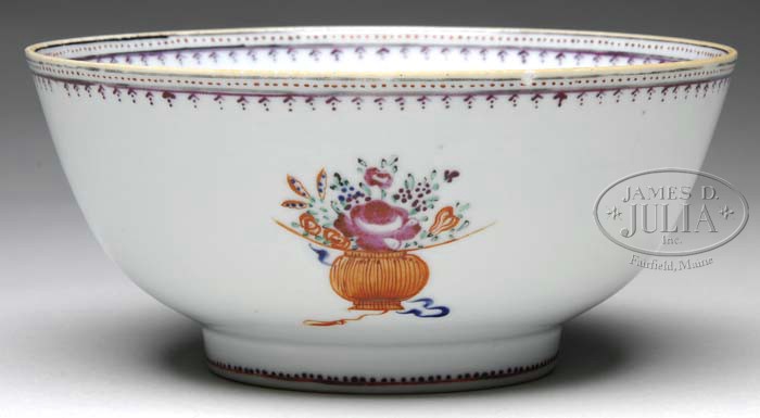 CHINESE EXPORT PORCELAIN BOWL. Very lovely Chinese Export porcelain bowl is decorated with a hand painted flower pot with red flowers and green leaves with a blue ribbon lying beside. Rim of the bowl is decorated with a band of purple stylized flowers on the inside and out and a single red flower adorns the interior bottom of the bowl. SIZE: 6-3/4″ dia. PROVENANCE: A gift to the Maine State Museum being sold to benefit the museums acquisition fund. CONDITION: Very good to excellent with two tiny flakes on outside rim of bowl. 5-61940 (100-200)