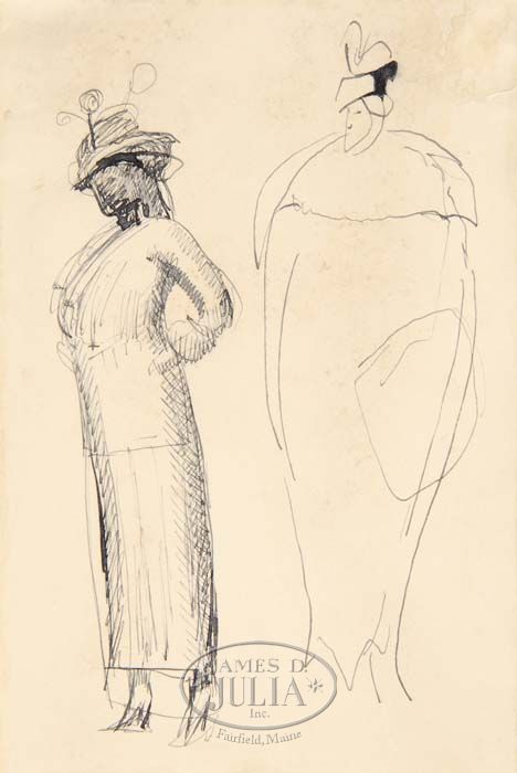 ELIE NADELMAN (AMERICAN, 1885-1946) SKETCH OF A WOMAN. Pen sketch on paper showing a woman in a long dress with fancy hat in a side view. Beside her is a line drawing of a woman. Hinge mounted to an ivory backing with a cut Estate of Eli Nadelman label. Housed in a hinged matte with rectangular opening. PROVENANCE: From the Estate of Lincoln Kirston. SIZE: 7-1/4”h x 5”w. CONDITION: Some light staining and foxing. Good. 9-90167 MD (3,000-5,000)