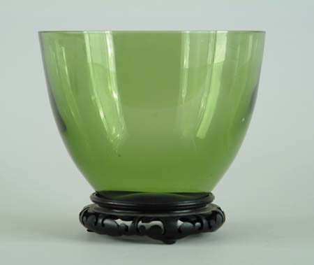 STEUBEN GREEN GLASS BOWL. Fleur de lis mark to base. Accompanied by a conforming teakwood stand. SIZE: 5-3/4” h x 7-3/4” dia. CONDITION: Very good. 9-96467 (100-200)
