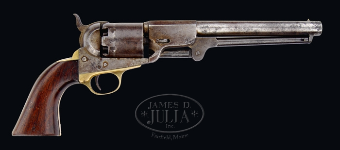 CONFEDERATE LEECH AND RIGDON REVOLVER INSCRIBED BY A MISSISSIPPI CAVALRYMAN. SN 346. A fine early serial numbered specimen of this rare Confederate revolver made by Thomas Leech and Charles H. Rigdon in Columbus, Mississippi. Guns with small “Leech & Rigdon” dies such as this under the mid 400 SN range are thought to be made in Columbus, MS before factory was later moved to Georgia. The revolver, serial number 346, generally follows the pattern of the Colt Model 1851 Navy being .36 caliber with a 6-shot cylinder, 7 ½” part round, part octagon barrel marked on the top flat of the barrel’s octagonal breech “LEECH & RIGD– .” The letters “C.S.A.” are not present either due to a variation in the barrel marking on an incomplete stamp (which is likely because the last two letters of the firm’s name are not visible). Walnut one-piece grips with brass trigger guard and back strap. All marked parts match. In place of the more common 4-dot cross mark on the brass trigger guard, the capital letter “N” is stamped on the left side of the trigger guard. The serial number on the cylinder is unusual and interesting being stamped “346” with an additional “3” above the “4” and an additional “4” below the “3” almost as if the worker could not decide whether to stamp the serial vertically or horizontally. Before the Civil War, Thomas Leech was a cotton trader and Charles H. Rigdon was a scale maker. Together their association would produce for the Confederacy one of the best revolvers of the time that could easily compete with the 1851 Colt Navy, of which it was a direct copy. Thomas Leech is also known to have had other business interests, for some Derringer pistols have survived that are marked “made for Thomas Leech & Co, Memphis, Tenn”. He had also founded the Memphis Novelty Works in 1861, a company specialized in the manufacture of cutlery, in particular, a number of Confederate swords. By May, 1862 the company was known as Leech & Rigdon, and was established at Columbus, Mississippi. The partners secured a contract with the Confederate States Government for the manufacture of 1,500 revolvers of the Colt Navy 1851 type. The Leech & Rigdon Company moved from Columbus in December of 1862 due to the impending Union threat. The manufactory was moved to Greensboro, Georgia; and all efforts were concentrated on the manufacture of revolvers. The partnership dissolved for unknown reasons in December, 1863, with a total about 1,500 revolvers produced. Charles Rigdon bought the company’s machinery and tools, kept the workers and reinstalled the plant at Augusta, Georgia, where he was joined by Jesse A. Ansley and two other partners, with whom he formed the Rigdon, Ansley & Co. The new company would continue to produce revolvers of the same type for the Confederate army. The original Leech & Rigdon’s contract for 1,500 pistols seems to have been achieved, and from serial # 1500 on, the company started the production of guns equipped with a 12 slot cylinders, which are today known as the Rigdon Ansley revolvers. On the back strap appears the name “Thomas Ruddick” which has been hand scratched into the brass. Initial research shows a Thomas Ruddick in the 28th Mississippi Cavalry Regiment, C.S.A. an important Western theater cavalry regiment, a quick glimpse of their history shows that this regiment was organized early in 1862, for three years. The original officers — Starke, Ferguson and Jones — were commissioned February 24, 1862; the regiment was reported May 14 in at Camp at Jackson, where it was organized. Colonel Starke was a man of prominence and had organized a cavalry company in his home county, Bolivar, early in 1861. The first active service of the regiment was occasioned by the naval attack on Vicksburg, beginning in May, 1862. Five companies of Starke’s Cavalry reinforced Gen. M. L. Smith, at Vicksburg, and were posted to watch the flanks along the Yazoo and below Warrenton on the Mississippi. Later the regiment was at Camp Burrus, in Bolivar County. They operated along the river and in the swamp country, where many contracted fever. At Vicksburg in December, 1862, part of the regiment took part in the Chickasaw Bayou campaign, while the remainder of the regiment, according to Federal reports, was engaged with Steele’s expedition from Helena, in the vicinity of Panola, in the same month. In January, 1863, the regiment was assigned Gen. W. T. Martin’s Division of cavalry under General Van Dorn, about 7,500 strong, which fought in the campaign in Middle Tennessee early in 1863, supporting General Bragg’s army. They were present at the battle of Thompson’s Station, March 5, but held in reserve; were in the skirmish with Minty’s Cavalry at Thompson’s Station, March 9, and actively engaged in the attack on Franklin, April 10. Van Dorn’s campaign, during which he lost his life in a private affair, left Mississippi open to Grierson’s raid and Grant’s advance from Bruinsburg to Jackson and the Yazoo River. The Twenty-eighth, leaving Tennessee May 17, reached Mechanicsburg June 7, a march of 400 miles where they attacked a detachment of the Fourth Iowa Cavalry, under Major Parkell. July 4 the regiment moved from Mechanicsburg to Birdsong’s Ferry, and as Johnston’s army fell back to Jackson, they skirmished with Sherman’s advance July 7, and fell back covering Johnston’s retreat, skirmishing frequently and resisting a charge of cavalry at Clinton. Just before the evacuation of Jackson, July 16, they went to the Federal rear, and recrossed Pearl River after the retreat of Johnston to Morton. After the evacuation of Jackson by Sherman, the regiment was at or near Clinton until moved to Brownsville in September. On October 10th detachments from the 28th were attacked, near Port Gibson by a force of Illinois and Wisconsin Cavalry, whose commanding officer reported 11 of the two regiments killed. October 14th McPherson’s expedi