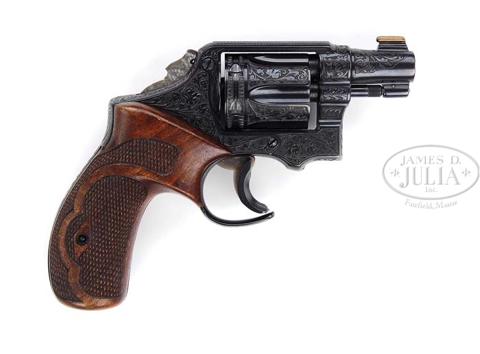 *FINE ARNOLD GREIBEL ENGRAVED SMITH & WESSON PRE-MODEL 10 DA REVOLVER. SN C175558. Cal. 38 Spcl. Blue finish with 2″ bbl and a replacement brass front sight bead. Frame is 5-screw type with “Fitz”-style cutaway trigger guard and bobbed hammer. It has rnd butt and is fitted with fine, fancy checkered David Wayland walnut grips. Frame, cyl, bbl & backstrap, along with the trigger guard are beautifully engraved by Arnold Greibel in flowing foliate & floral patterns with punch dot background. Top strap is engraved with chip & fleur-de-lis borders and rear edge of cyl with a dbl row of scalloped borders. Back of frame, around hammer slot, is engraved in feather patterns with a fine shield pattern at top of backstrap. Back strap is engraved in flowing leaf pattern. Accompanied by a signed 3-page letter from Henry Black. Mr. Black, in his letter, states that after he returned to Chicago after WWII a friend invited him to visit Arnold Greibel, which he did, and Mr. Greibel engraved this revolver for him. The undated letter states that Mr. Black was, at the time of writing, 84 years old. CONDITION: Extremely fine plus. Overall retains virtually all of its fine post-engraved finish with no evidence of having been fired since engraving. Grips are equally fine. Mechanics are crisp, bright shiny bore. 4-39009 (2,500-3,500)