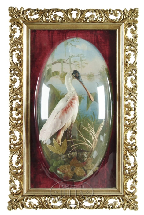 FRAMED DIORAMA WITH STUFFED SPOONBILL. This wonderful taxidermy presentation has a standing pink and white Spoonbill on a small stump with marsh grass and leaves beside. The oval backdrop is oil painted with a scene reminiscent of the everglades with water, islands and moss hanging off trees. The inner matte, which goes from oval to square, is of a crushed red velvet. The outer frame is pierce carved with foliate scrolls. The front glass has a large bulging oval bubble housing the picture and bird. PROVENANCE: From a fine Corrina, Maine home. SIZE: Overall is 48” x 31”. CONDITION: Very good. 9-28562 (500-1000)