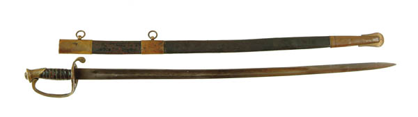 LEECH & RIGDON TYPE FOOT OFFICERS SWORD W/ SCABBARD. The guard, pommel and grip are similar to that illustrated in Albaugh’s “Photographic Supplement…” Fig 22-C. The top left surface of the guard features a cast “CS” in oval, the grip is leather-covered and wrapped with dbl twisted strands of brass wire. The blade with unstopped fullers, is plain with no stamps or etchings. The foreign-made sheath is of one-piece leather construction, stitched at the spine, and fitted with brass mounts. The leather is embossed with two lines on each side, conforming to the shape of the sheath. The mounts are bordered with fine grooves and are otherwise unadorned. The throat and tip are each attached with a single screw at the back and the center mount is attached with a pin at the spine. While the sword appears to be a Leech & Rigdon Confederate foot officer’s sword, we cannot and will not guarantee that. Size: 37-1/2” overall incl. drag. 32” long blade. CONDITION: Leather wrap is worn through in two places on the right side of the grip – the wire wrap is intact. There are some dents in the pommel, though the hilt and guard are good overall. Blade exhibits light pitting and staining, but has no nicks or chips. Scabbard mounts have a dark reddish patina, and most of the leather’s finish is alligatored and/or flaked. 4-51233 (9,500-11,500)