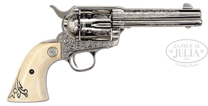 *NIMSCHKE STYLE ENGRAVED COLT SINGLE ACTION ARMY REVOLVER. SN 188022. Cal.41 Colt. Nickel finish with 4-3/4″ bbl, full front sight and 2-line address with cal marking on left side. Left side of frame has 2-line 3 patent dates and Rampant Colt in circle. Mounted with modern replacement 2-pc ivory grips with Colt silver medallions and lightly carved foliate arabesque patterns on heels. Revolver is engraved in L.D. Nimschke style patterns with about “B” coverage having foliate arabesque patterns with punch dot background on sides with a wonderful fan and foliate pattern on recoil shield and loading gate. Top strap is engraved in snake and dash patterns with foliate arabesque patterns extending over sides of bbl. Ejector housing has snake and dash pattern in top gullet with wonderful foliate arabesque and diamond pattern on outer radius. Top of backstrap is engraved with a fan pattern like Mr. Nimschke’s typical style with geometric patterns down backstrap. Trigger bow is engraved with very fine detailed Hunter’s star. Cyl is engraved with foliate arabesque patterns on lands between the flutes with feather and straight line border on rear edge. PROVENANCE: Wes Adams Estate Collection. CONDITION: Very fine, overall retains about all of its modern, custom, bright nickel finish, probably unfired since engraving; grips are sound with an artificially aged patina; hammer is not solid in safety notch, otherwise mechanics are fine; strong bore with moderate to heavy pitting. 4-44718 JR273 (4,000-6,000)