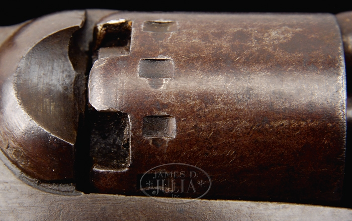 RARE CONFEDERATE RIGDON, ANSLEY & COMPANY 12 STOP REVOLVER SN 1762. This Confederate revolver, serial number 1762, was produced by Rigdon, Ansley & Company of Augusta GA and is, generally, patterned after the Colt Model 1851 Navy. About 1,000 of these were made in .36 caliber with a 6-shot round cylinder having 12 stops on the exterior. All iron with brass trigger guard and back strap with one-piece walnut grips. A marvelous opportunity to obtain a classic and rare Confederate revolver manufactured in Augusta, GA during the American Civil War. Mr. Michel’s Notes State: “The Rigdon, Ansley & Co. revolvers were basically the same revolvers as those produced by Leech & Rigdon. The most recognizable difference is the adoption of a 12-stop cylinder. When the Leech & Rigdon partnership dissolved, Charles Rigdon moved the plant and formed a new company with Jesse A. Ansley, Andrew J. Smith, and Charles R. Keen under the new name Rigdon, Ansley & Co. Rigdon, Ansley & Co. revolvers begin at about serial number 1500 with the highest serial number known in the 2400 range. This revolver is serial number 1762 and in keeping with other known revolvers in that range is marked on the barrel housing only, “CSA”.” CONDITION: Fine, all iron parts have aged to a pleasing dark brown patina, never cleaned and with only moderate wear. Two cylinder nipples are broken. Brass parts have an equally pleasing patina and the revolver functions mechanically well, however, its ability to stay at full cock is touchy. 4-31351 CW3 (25,000-35,000)
