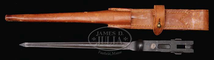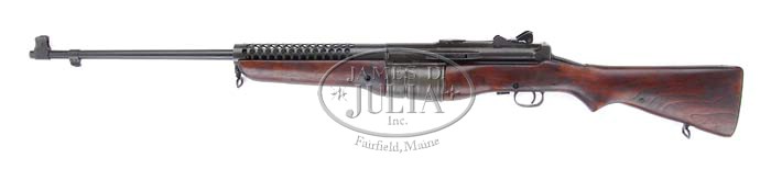 Correction: The printed catalogue is incorrect. SN A8942 not 48942. *RARE MODEL 1941 JOHNSON SEMI-AUTOMATIC MILITARY RIFLE WITH BAYONET. SN A8942. Cal. 30-06. Usual configuration with 22″ tapered rnd bbl, tall winged front sight with replacement ivory bead insert. It has its orig long spring steel rear sight adjustable for windage & elevation. Top of receiver has usual markings. Mounted in a 2-pc uncheckered walnut stock & forearm with semi-pistol grip stock & checkered steel buttplate with sling swivels. Accompanied by its very rare orig Johnson bayonet & leave in leather sheath. Also accompanied by an orig military leather sling. CONDITION: Extraordinarily fine, as new, has been fired but very little. Metal retains about all of its orig greenish parkerized finish & wood virtually all of its fine orig oil finish. Forearm has what appears to be a pinned reinforcement. Mechanics are crisp, bright shiny bore. Bayonet is extremely fine as is the sheath. Sling is also fine. 4-35086 JR419 (4,000-6,000)