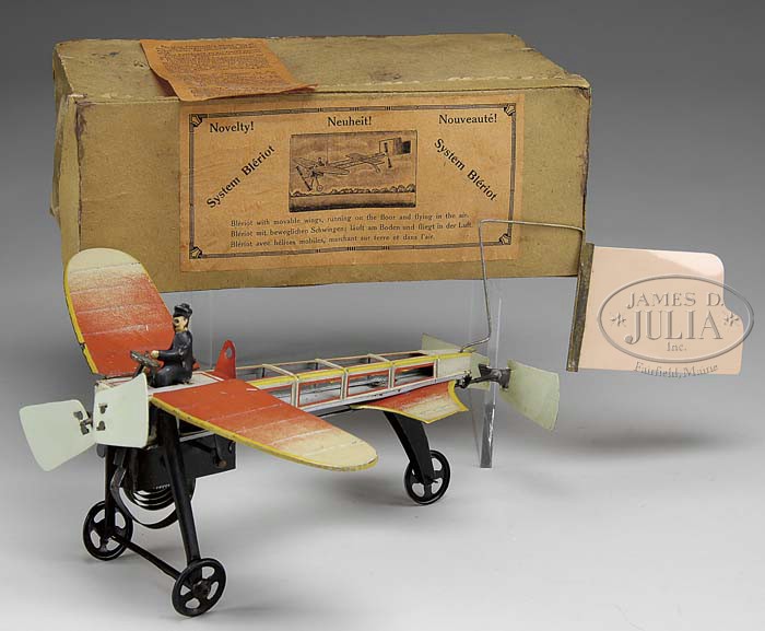 Please Note: The Rare Bleriot airplane rear propellors have been reattached at one time. BOXED FISCHER “FLAPPING WING” BLERIOT AIRPLANE TIN W/U TOY. An awesome toy from the early 20th century manufactured by Fischer who produced many unique and interesting toys. This particular piece retains its original box with a picture of the toy on the lid as well as the paper instructions. The mechanism contained under the pilot when wound would activate the front and rear propellers and as it rolled upon the ground the wings would give the illusion of flapping and taking this toy airborne. The airplane body and pilot are of high quality lithography and the propellers and rudder are of celluloid. A unique form as well as a very desirable and highly sought after toy. It is a rarity to still have the original box and instructions! SIZE: Approx. 10″ l excluding rudder. CONDITION: Very fine plus. 1-11521 (3,500-5,500) Auction: Advertising, Toy & Doll - Fall 2011 Please Note: All prices include the hammer price plus the buyer’s premium, which is paid by the buyer as part of the purchase price. The prices noted here after the auction are considered unofficial and do not become official until after the 46th day. |