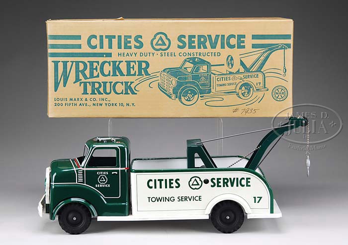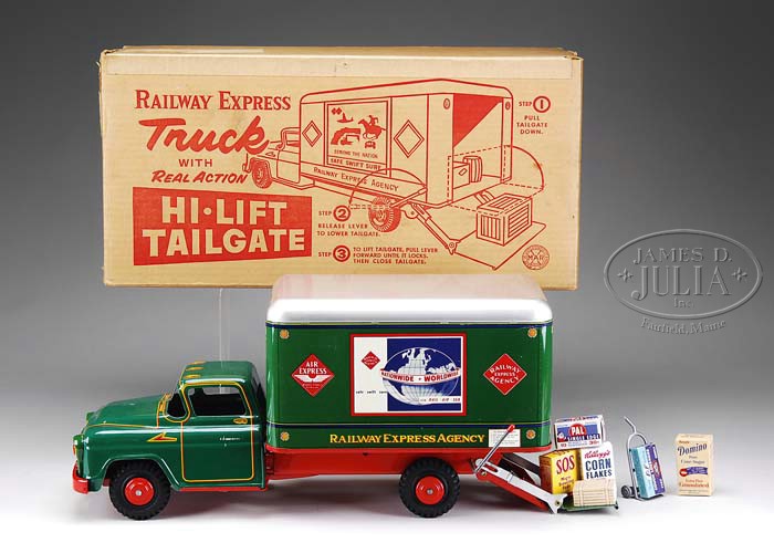TWO SUPERB MARX TRUCKS IN ORIGINAL BOXES. 1) USA. Large and impressive pressed steel wrecker marked “Marx City Service” in the best of condition. Crank operation tow hook, solid rubber tires marked “Wyandotte” and grill marked “LMC” (Louis Marx Company). Hard to find complete with original assembly sheet and very colorful folder showing other Marx toys. 2) USA. Model No. 1021. Vivid green, yellow and red graphics on this dynamite Railway Express Agency boxed delivery truck, Circa 1957. Amazingly this working lift-gate truck retains approx. 15 advertising miniature boxes including Wrigley’s, Domino, Kellogg’s, SOS and more. Also includes original dolly, wooden barrel, Railway Express Agency transport sack and complete set of gummed shipping labels. Cool. Original box has red graphics showing operation of the Hi-Lift Tail Gate Truck. SIZE: 20″ l & 19-1/2″ l respectively. CONDITION: 1) Plastic roof horn is split. Toy and box appear unused. Scuffing to front bumper, otherwise excellent plus with all original packing materials present. 2) Near excellent and working with all graphics intact. Contents appearing to be complete. Rubber tires marked “Wyandotte”. Box is crisp and complete. 1-9249, 1-9252 (450-600) Auction: Advertising, Toy & Doll - Spring 2009 Please Note: All prices include the hammer price plus the buyer’s premium, which is paid by the buyer as part of the purchase price. The prices noted here after the auction are considered unofficial and do not become official until after the 46th day. |