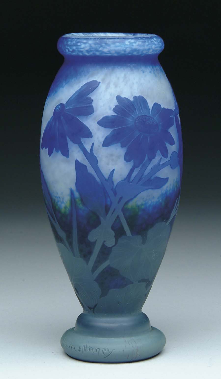 DAUM CAMEO VASE. Very fine Daum vase has royal blue daisies with gray stems and leaves against an internally decorated blue, yellow and white background. Background on lower half of vase is martelle. Vase is signed on side of foot “Daum Nancy”. SIZE: 7-1/4 in. t. CONDITION: Very good to excellent. 5-61127 (6,000-8,000)