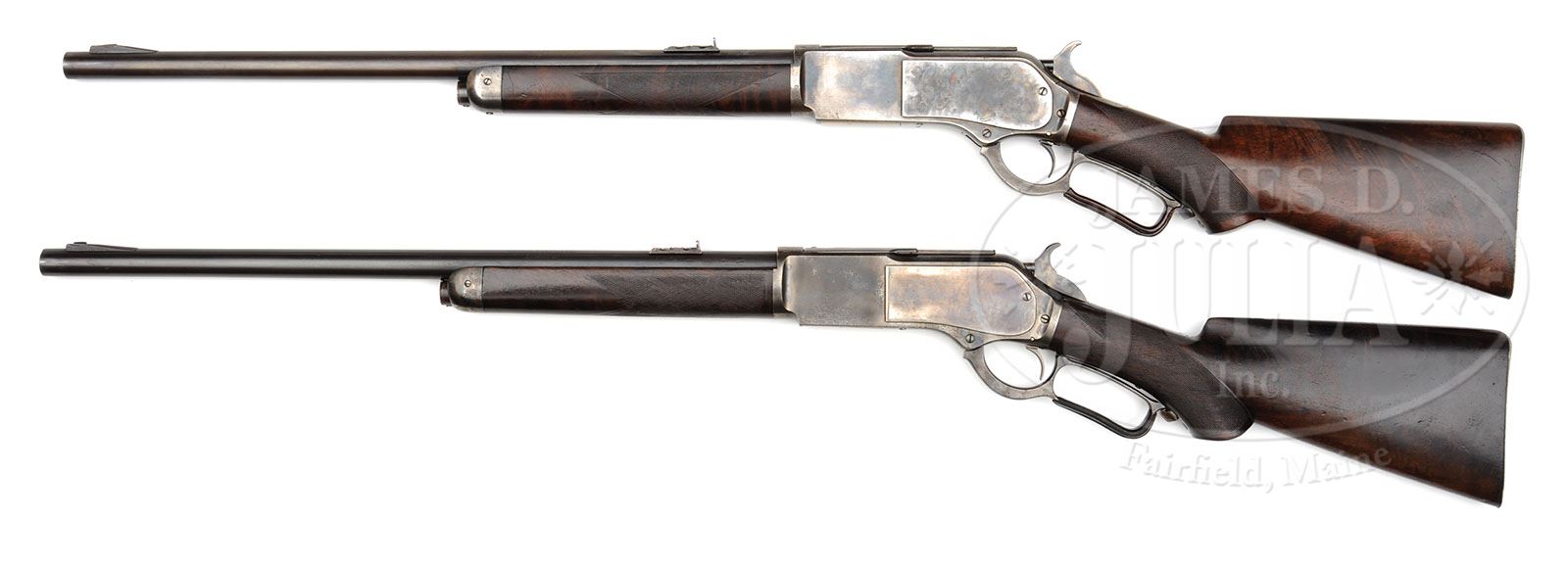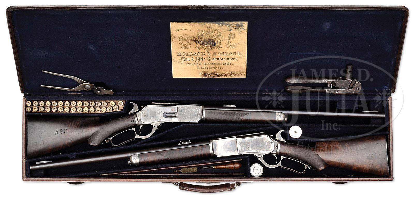 Both rifles have Cody Firearms Museum worksheets and letter in current configuration. EXTRAORDINARILY RARE CASED PAIR OF ENGLISH MARKED WINCHESTER MODEL 1876 LEVER ACTION DELUXE EXPRESS SHORT RIFLES. SN 9979 & 19511. Cal. 50 Express (50-95). Rifles are nearly identical with 22″ rnd bbls, Holland & Holland ramp front sights with 3-leaf, 2-folding, 1-standing Holland & Holland platinum line express rear sights and each has a thick base adjustable tang sight with 4″ staff. Rifles are 2nd Model with screwed-on dust cover rails and dust covers marked “WINCHESTER EXPRESS / .50 CAL. 95 GRS.” Levers are professionally leather covered in English style. They are both mounted with very highly figured 2-3X American walnut with checkered forearms, pistol grip stocks and smooth steel buttplates. Both forearms are in short rifle style of 8-3/8″ in length vs. the standard 9-3/8″. Both have black fleur-de-lis inlays in their gripcaps. Both have half magazines that appear to have been reduced from full length with flat magazine caps as would be found on a full length magazine, probably from the factory as rounded half magazine caps were probably not available at the time of manufacture. Both bbls have standard Winchester markings and both are engraved adjacent to the standard bbl marking “SIGHTED & REGULATED / BY HOLLAND & HOLLAND / 98 NEW BOND ST. / LONDON.W.”. Bbls & receivers are English proofed and carriers are marked “50-95”. 1) SN 9979: Has early style checkered forearm and a convex grip cap with the number “11” at the front right side of the wrist and “AFC” branded in right side of buttstock. Left side of lower tang, under the wood, is marked “XX” and has assembly number “827” which number is also found in top tang channel of buttstock. Buttplate is unmarked but there is no doubt it is orig to this rifle, the fit is perfect. Dust cover is 2nd type with impressed thumb print. 2) SN 19511: Has H-style checkered forearm & serpentine grip cap and has “PHC” branded in right side of buttstock. Left side of lower tang is marked “XX” and has assembly number “211” which number is also found in top tang channel of buttstock. Buttplate is unmarked but is also absolutely orig to this rifle. Dust cover is 3rd type without thumbprint. Accompanied by an orig Holland & Holland blue felt lined dbl rifle leather trunk case compartmented in the bottom for the two rifles and a cartridge block in the left rear that contains 30 orig, non-hand stamped, copper tube cartridges. Front compartment contains a 2-pc brass & wood cleaning rod, a small wood-handled turn-screw and a cotton mop. Also included in the case is a large Holland & Holland pewter oil bottle and in another compartment is a small tin container with nickeled top containing four tang sight screws. Inside the lid has an orig Holland & Holland paper label. Top of case has a large empty brass medallion in the center and is branded toward the back edge “PERCY H. COOPER”. Top also has two very old partial labels, one of which is from a cutlery maker and addressed to “P. Cooper / Luna(?) House / Trafalgar Square / London”. The other label is from the “GREAT WESTERN RAILWAY / TORRE / TO / PADDINGTON”. Additionally accompanied by a set of early Winchester loading tools marked “EXPRESS”. Bullet mold is hollow point style that has had the hollow point groove permanently plugged with a pin. Also accompanied by a quantity of ammunition including one orig box of very rare 50-95 shot cartridges in 2-pc box that has red & white over-label “FOR SINGLE SHOT RIFLES ONLY” and “SHOT CARTRIDGES”. Additionally accompanied by five full boxes of orig Winchester ammunition in 20-rd boxes, one full box of Eley Bros. 50-95 cartridges and 27 loose rds of orig ammunition, a total of about 152 rds, most of which have copper tube lead bullets. Additionally accompanied by a letter from the secretary of Lord Lyon, Edinburgh, Scotland, dated 1973, which shows that Percy Hartshorne Copper lived at Bullwell Hall, Nottinghamshire, England and Carr House Doncaster. He was born in 1855 and died 1893. Also accompanied by Buffalo Bill Historical Center letters for both rifles which identify them in their current configuration and showing #9979 as having “short butt”(fitting only in one unique case compartment), received in warehouse April 21, 1880 and shipped next day with 10 other rifles with same specifications. #19511 received “inside finish”, proper for English orders, was received Dec. 14, 1881 and shipped next day. A letter from Holland & Holland states that they were unable to locate any record of any Winchester rifles that they had shot and regulated as they were not serialized by them. PROVENANCE: Rifles featured in Winchester Collector Magazine V.23 Issue 4 (Fall 2000.) CONDITION: 1) #9979 Fine. Bbl retains about 95% orig blue turning to patina; receiver & sideplates retain strong case colors in sheltered areas, moderately to heavily faded on sideplates, turned silver elsewhere; hammer retains strong case colors and the lever case colors in sheltered areas; leather covering on lever shows moderate to heavy wear. Wood is sound with a few light nicks & scratches, shows heavy wear on checkering and overall retains a dark handworn oil finish. Mechanics are fine, bright shiny bore with fine pitting in the grooves. 2) #19511 Fine to very fine. Bbl retains mostly a plummy/blue patina with a thin spot around the rear sight; receiver & sideplates retain orig case colors in sheltered areas, mostly fading to silver; left sideplate appears to have at one time been polished and then torch-colored; hammer retains strong case colors and the lever faded case colors on the exposed areas. Wood is sound with normal handling & use nicks & scratches with the buttstock retaining generous amounts of its orig oil finish and the forearm a handworn oil finish with both stock & forearm showing moderate to heavy wear on checkering. Mechan