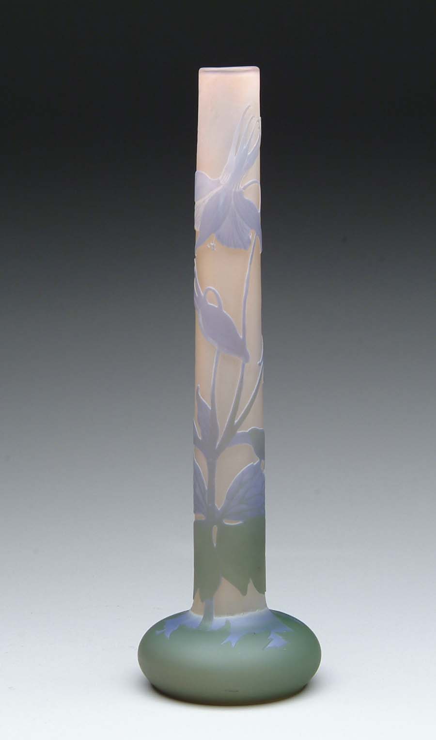 GALLE CAMEO STICK VASE. Lovely Galle stick vase has lavender, green and white cameo flowers, leaves and vines against a pink background. Signed on the side in cameo “*Galle”. SIZE: 11 in. t. CONDITION: Very good to excellent. 5-61247 (1,800-2,200)