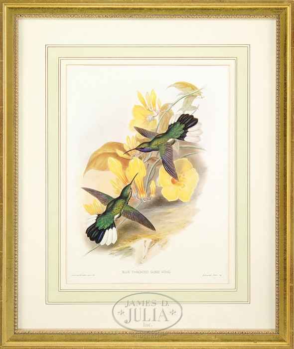 PAIR OF BIRD PRINTS AFTER GOULD AND RICHTER. Colored prints titled “Blue Throated Sabre Wing” and “Purple Breaster Carib”. Both identically housed in modern gilt frames with colorful highlighted mattes. SIZE: Sight: 15-1/2″ x 11-1/2″. CONDITION: Very good. 9-92759 (500-800)