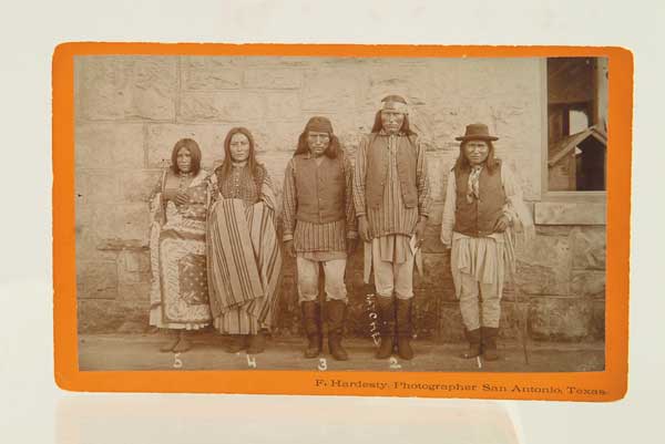 CABINET CARD PHOTO OF CHIEF NATCHES AND SOME OF HIS BAND. 8” x 5” cabinet card depicting three Apache braves and two women. Written in pencil on the reverse is “Geronimo’s Indians.” The Chiracahua Chief Natches (Naiche, son of Cochise) is identified by name in the emulsion, while the other 4 people are simply numbered. No. 3 is likely Eyelash (also called Fun), one of the very bravest Apache warriors. They are posed against a very imposing stone building – perhaps a fort or church. The photograph is by F. Hardesty of San Antonio, Texas and the back is imprinted with a list of photos available of San Antonio and the vicinity. CONDITION: Very good with only slight edge wear and staining. 4-50105 SO9 (800-1,200)