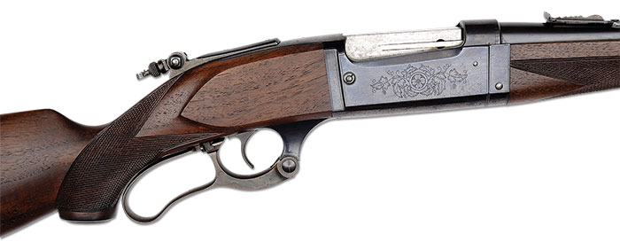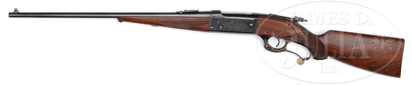 *FACTORY ENGRAVED PISTOL GRIP LIGHTWEIGHT TAKE DOWN RIFLE. SN 188325. CAL. 250/3000. 20″ round bbl. This gun features a very rare style of engraving which is referred to as Bargain grade, a very fine grape vine scroll located in the center of the receiver. Pistol checkered A-style wood with a shotgun grade buttplate. Original front sight, correct Savage rear sight, and folding Lyman tang sight. All original little gun complete with a very interesting unique pattern of engraving. There are only a few done with this pattern engraving. PROVENANCE: Wes Adams Estate Collection. CONDITION: Overall gun is in excellent condition with 98% original bright blue, original semi-deluxe wood is excellent with crisp sharp checkering. Bright shiny bore. 4-44798 LM95 (4,000-6,000)