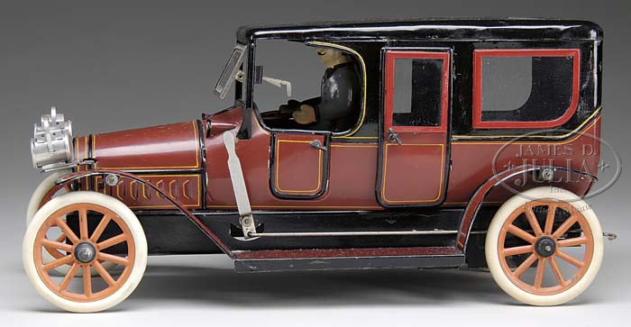 LARGE KARL BUB LIMO. Limo is brown with gold and black pin stripping, two separate deluxe head lamps, hand painted driver, opening front window, glass on doors and passenger windows, rubber tires and has a hand brake. SIZE: 14″ l. CONDITION: A great car with an appealing look. However, toy appears to be completely restored. Head lamps, tires, and figure are replacements. 1-11496 (800-1,200)