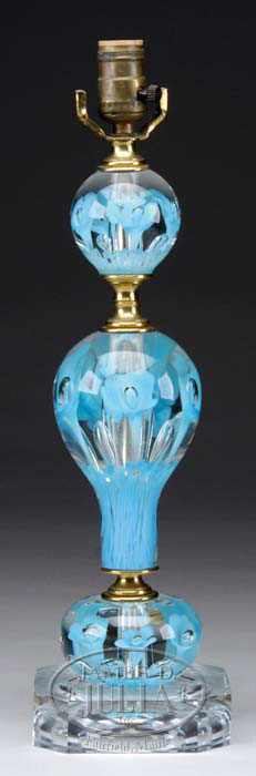 ST. CLAIR PAPERWEIGHT LAMP BASE Three-tiered lamp base with ice pick lily decorations in pastel blue. Attributed to St. Clair. SIZE: 28-1/2″ t to top of finial. CONDITION: Very good to excellent. 5-65004 (200-300)