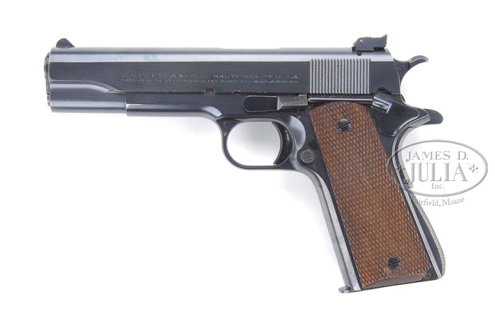 *RARE PRESENTATION COLT GOVERNMENT MODEL NATIONAL MATCH SEMI-AUTO PISTOL. SN C185881. Cal. 45 ACP. Blue finish with 5″ bbl, serrated front sight and an orig Stevens adjustable rear sight. Mounted with orig full checkered walnut grips with a correct commercial marked 2-tone magazine. It has the 1911A1 configuration with short trigger, a short, wide hammer spur and long grip safety spur and arched spring housing. Slide is matching numbered to frame and it has its orig bbl marked on lower left “COLT 45 AUTO MATCH”. Left side of slide has the usual Colt markings with last patent date “1913”. Right side of slide has the National Match and Colt markings with frame marked “GOVERNMENT MODEL” over serial number. Top of slide between ejection port & sight is engraved through the blue “PRES. TO CAPT. A.E. DE CESARIS / FROM CO. F. 14TH INF. N.Y.N.G. 1940”. Accompanied by its orig hinged lid dark maroon box with black & white end labels with top label “NATIONAL MATCH / ADJUSTABLE SIGHT”. Corners & center of box have scotch tape. Bottom of box has the serial number of this pistol in pencil. Also accompanied by an orig owner’s manual, the orig target for this pistol, five shots at fifteen yards by J.M. Molloy, with all five shots in the ten ring with three X’s. Additionally accompanied by the orig hang tag showing the adjustments for the rear sight, an orig screwdriver envelope and a “Shooting Suggestions” pamphlet. CONDITION: Extremely fine plus, all matching. Overall retains about 98% strong glossy orig factory blue with only slight muzzle edge wear on left side from sliding in the box. There are two small spots of chemical staining on left side of the frame above magazine release and some chemical spotting on back strap by the mainspring housing. Magazine is crisp as are the grips. Crisp mechanics and brilliant shiny bore. 4-37419 JR132 (7,000-12,000)