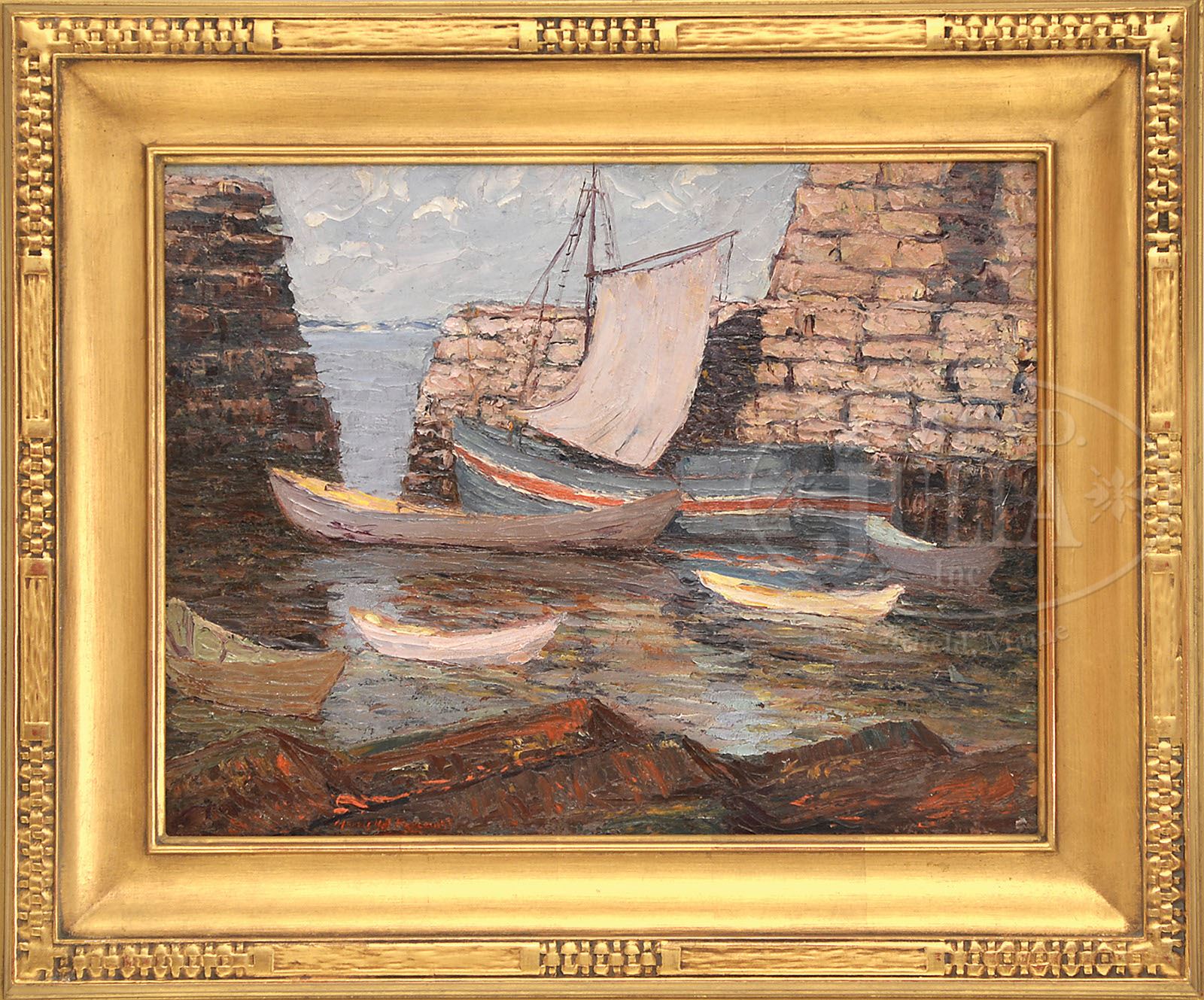 MORRIS HALL PANCOAST (American, 1877-1963) “MARBLEHEAD MASS”. Oil on board Housed in a modern carved and gilt wood frame Signed lower left “Morris Hall Pancoast” SIZE: 14″ x 18″. Overall: 20-1/4″ x 24″. CONDITION: Very good. 9-29528 (1,500-2,500)