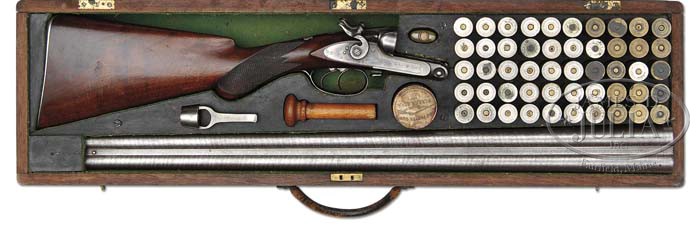 EARLY PARKER NO. 2 LIFTER HAMMER GUN WITH ORIGINAL CASE AND ACCESSORIES. SN 9243. (ca 1875) Cal. 10 ga. 2-4/8″ Chambers. 28″ Fine Damascus bbls are engraved “PARKER BROS “MAKERS” MERIDEN CONN “DAMASCUS STEEL”” on low narrow top rib. Frame size “2” is on rear lump. Case hardened 1875 patent improved lifter action has nicely filed fences, is engraved with geometric borders and flourishes of scroll. Front action rebounding locks have flat-sided high spurred hammers. “Parker Bros” is on each lockplate. 1875 Patent is on trigger plate. Figured American walnut semi-pistol grip round knob buttstock measures 14-1/8″ over blued steel buttplate, and features standard checkering and inlet silver shield at top of grip. Matching splinter forend has filed steel tip, and attaches with side nail through line border engraved oval steel escutcheons. Bore diameter: left-.795, right -.795. Bore restrictions: left -.030, right -.034. Wall thickness: left -.040, right -.043. Drop at heel: 2-3/4″, drop at comb: 2-1/8″. Weight: 8 lbs. 9 oz. LOP: 14-1/8″. Original dovetailed black walnut case with pivoting hook latches and leather handle, is lined in green cloth, containing a number of original and period accessories. Accessories include wad cutter and rammer, glass bottle with small cork stopper containing lubricating oil, large japanned tin with Parker Bros paper label containing Berdan primers, and 50 metal casings: 46 Parker Bros Meriden Conn marked and 4 UMC 10 ga cases(16 brass and 34 nickel-plated). CONDITION: Very fine. Bbls retain 80% orig Damascus finish. Action retains 30% orig case hardening color, locks 50 – 60%, balance being a pleasing silver. Trigger guard and buttplate retain most of their orig charcoal blue. Stocks retain most of their orig varnish with numerous marks, grain slightly raised, checkering slightly worn. Bores are fine with light frosting and some minor pits. Action is tight. Bbls are on face. Locks are crisp. Exterior of case is very fine, with a few marks and scuffs in orig finish, and a few minor cracks in lid. Interior cloth is fine, lightly soiled, and rubbed. Primer tin is excellent, label foxed and stained with some chips around edge. Cases are good to fine. All specifications of this well preserved early Parker match those listed in Parker Gun Serialization and Identification ledger. 4-46031 MGM304 (6,500-9,500)