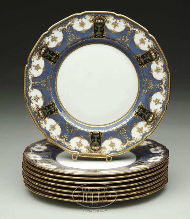 FINE SET OF EIGHT ROYAL DOULTON SERVICE PLATES. Green mark to base and “Made in England”. Numbers on back “RA9602 H.1376”. Wonderful plates have white blank with medium blue border, gold trim with urns of fruit against a black background. PROVENANCE: Woolworth Collection (FW Woolworth Dept. Store).SIZE: 10-1/4” dia. CONDITION: Very good, no chips, cracks and few if any knife marks. 9-28121 (400-800)