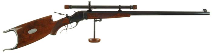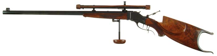 *RARE CASED WINCHESTER HIGH WALL TAKEDOWN SCHUTZEN RIFLE. Cal. 32-40. SN 109315. Spectacular & rare cased high wall with 30” No. 3 weight oct bbl, windgage globe front sight, slot blank in rear seat with a mid-range vernier tang sight with 3” staff. Mounted with spectacular flame grain, highly figured, checkered, American walnut with black insert, semi-schnable tipped forearm and heavy Schutzen stock that has squared comb and thick cheekpiece with checkered, capped pistol grip and a Helm steel Schutzen buttplate with long prongs. It also has Schutzen dbl set triggers with spur lever. Top of the bbl is factory drilled & tapped for target scope blocks and it is accompanied by a Winchester A5 target scope with its orig lens covers and extremely rare leather carrying case. Forearm is factory fitted with a palm rest base. Left side of lower tang, under the wood, is stamped with the assembly number “7756” and “X”. Assembly number is also found on butt of the stock, under the buttplate and inside toe of the buttplate. Right side of buttstock has 2-3/16” silver oval inlay engraved “PRESENTED / BY / J. & M. Haffen”. Also accompanied by its orig & extremely rare, green felt lined, leather trunk case, compartmented in bottom for stocked receiver, bbl, the orig mushroom palm rest, the orig semi-buckhorn rear sight with its orig envelope, a lead foil tube of Winchester grease, an old leatherette covered, gem razor box filled with over-powder cards and a punch. The other end has a compartment containing a box of 49 new primed empty 32-40 brass casings and two boxes of Winchester No. 5 primers, one full and one almost full. Also accompanied by a Cody Firearms Museum letter fully identifying this rifle as found with all accessories, although the case is not mentioned, as having been shipped May 25, 1910. It was returned & repaired Aug. 31, 1911. CONDITION: Extremely fine. Bbl retains 97-98% strong, orig factory blue with only faint, sharp edge wear. Receiver retains 95-96% strong orig blue with some freckling on the left side. Lever, hammer & breechblock retain most of their orig case colors, turned dark on lever and slightly faded on hammer, brilliant on breechblock. Wood is sound with very minor handling & storage marks and retains virtually all of its orig piano varnish finish. Buttplate retains about 50-60% orig blue with balance flaked to a medium patina. Will not cock on closing, otherwise mechanics are fine, brilliant shiny bore. Case & accessories and scope case are fine. The scope retains most of its orig blue with good optics. 4-30622 JR326 (25,000-35,000)