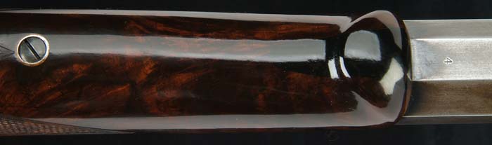 RARE DELUXE HIGH WALL SINGLE SHOT TARGET RIFLE. Cal. 38-55. SN 35554. Spectacular & unusual high wall with rare 36” No. 4 weight oct bbl, Beach’s ivory bead wind gage front sight, semi-buckhorn rear sight and a thin base, mid-range Vernier tang sight with 2-3/4” staff. It has a sgl set trigger. Mounted with extremely beautiful, flame grain, center crotch cut, checkered American walnut with H-style checkered, black insert, schnable tip forearm & pistol grip stock with black insert, serpentine grip and crescent buttplate. Left side of lower tang, under wood, has assembly number “2811” and “XXX”. Top tang channel of buttstock is stamped with this assembly number as is the inside toe of buttplate. Accompanied by a Cody Firearms Museum letter fully identifying this rifle with set trigger & checkered pistol grip stock, shipped Sept. 11, 1889. CONDITION: Fine to very fine. Bbl retains 80-85% orig blue, somewhat thin and turning plum about mid-point with sharp edge wear and muzzle wear. Receiver & lever retain most of their orig case colors, faded & turning silver. Stock has a couple of tiny hairlines, back of top tang, otherwise wood is sound and retains about all of a fine, professionally restored finish with freshened checkering. Mechanics are crisp, strong bright bore with some light pitting just in front of chamber. 4-30600 JR279 (22,500-32,500)