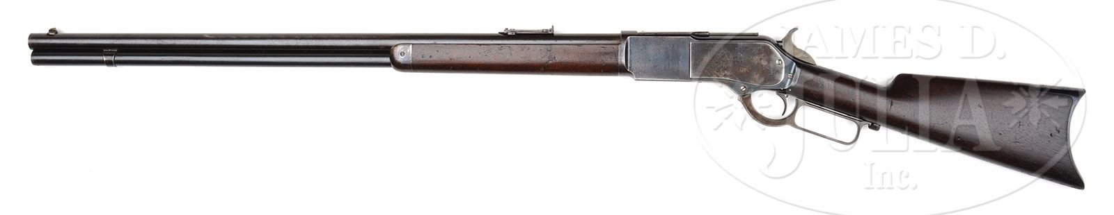 WINCHESTER SECOND MODEL 1876 LEVER ACTION RIFLE. SN 3795. Cal. 45-60. Standard grade rifle with 28″ rnd bbl, full magazine, half nickel front sight and “1876” marked ladder rear sight. Receiver is second type with screwed-on dust cover rail and plain dust cover and has sgl set trigger. Left side of lower tang, under the wood, is marked “11” and the assembly number “595” which number is also found in top tang channel of buttstock and “595” inside toe of buttplate. Mounted with uncheckered straight grain American walnut with straight stock & crescent buttplate with trap containing a 4-pc brass & steel cleaning rod. Accompanied by a Cody Firearms Museum letter which identifies this rifle with 24″ oct bbl and set trigger, received in warehouse June 28, 1878 and shipped next day with 49 other arms to Order #12111. Returned in May 1881 “by Skinker”, changed to rifle, 45-60, rnd bbl and shipped June 14, 1881 with 11 other arms to Order #25318. The caliber of this rifle would have originally been 45-75. CONDITION: Fine to very fine. Bbl retains strong blue in sheltered areas being mostly a dark patina with a spot of fine pitting about mid-point and some fine wear patterns further toward the muzzle; magazine tube retains strong orig blue, slightly thinned on outer radius; receiver & side plates retain 60-70% strong orig blue, thinner on side plates with some scattered fine surface rust; lever & hammer retain faded case colors on sides; buttplate retains about 80% bright blue. Wood is sound with a few light nicks & scratches in buttstock, somewhat more heavy on forearm and retains most of an old restored finish. Mechanics are fine, very bright shiny bore, shows very little use. Cleaning rod is fine. 4-48395 JR127 (3,500-5,500)