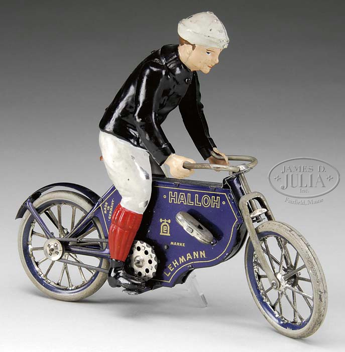 GERMAN LEHMANN HALLOH TIN WIND-UP MOTORCYCLE. Aesthetically pleasing large multi-colored hand painted boy sits on blue early motorcycle. Toy only stands while in operation. Bike is highly desired by motorcycle and early tin toy collectors. SIZE: 8-3/4″ l x 8″ h. CONDITION: Some minor flaking to hand painted figure. Some discoloration to wheels. Overall very good to near excellent. 1-10654 (1,500-2,500) Auction: Advertising, Toy & Doll - Spring 2011 Please Note: All prices include the hammer price plus the buyer’s premium, which is paid by the buyer as part of the purchase price. The prices noted here after the auction are considered unofficial and do not become official until after the 46th day. |