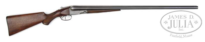 *PARKER VH 1-1/2 FRAME SHOTGUN. SN 197482. Cal. 12 ga. 2-5/8″ Chambers. 1-1/2 Frame. Gun matches all specifications in Parker Gun Identification and Serialization Ledger. 30″ Vulcan steel bbls have standard “V” action with wiggle line engraving, and “Parker Bros” on each side, and having capped pistol grip American walnut stock measuring 14-1/4″ over Parker dogs head buttplate, with standard checkering on buttstock and splinter forend. Bore diameter: left-.734, right -.733. Bore restrictions: left -.039, right -.024. Wall thickness: left -.022, right -.023. Drop at heel: 2-1/2″, drop at comb: 1-1/2″. Weight: 7 lbs. 5 oz. LOP: 14-1/4″. CONDITION: Very good to fine. Bbls retain most of their orig blue, thinned and browned considerably at normal carry and wear points. Action retains a considerable amount of its orig case hardening color, quite strong where protected, but is mostly bright silver. Stocks retain most of an old oil finish, edges slightly rounded, over numerous marks. Checkering re-cut, but not borders. Bores are excellent. Action is tight. 4-45596 MGM268 (750-1,500)