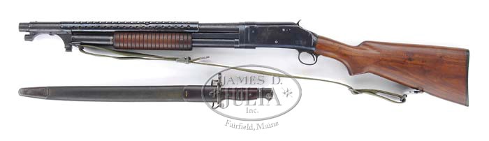 *RARE WINCHESTER MODEL 1897 MILITARY TRENCH GUN. SN 949639. Cal. 12 ga. Blue finish with 20-1/2″ cylinder choke bbl with 4-line perforated steel handguard & bayonet lug with sling loop & corresponding loop in buttstock containing a canvas “Nobukl” sling. Top of bbl, over chamber, has Ordnance Corps flaming bomb & left rear side of receiver a large “U.S.” & Ordnance Corps flaming bomb. Shotgun was originally built as a takedown model but when factory made it as a trench gun they turned it into a solid frame model. Mounted with uncheckered American walnut with rnd ribbed forearm & semi-pistol grip stock with Winchester embossed hard rubber buttplate. Left side of buttstock has “W.B.” inspector initials in a rectangle cartouche over a tiny ordnance wheel. Accompanied by an orig Winchester “1917” dated bayonet with 16-3/4″ blade & wood handles. Which has its orig green leather scabbard with steel throat & tip. CONDITION: Very good to fine. Overall retains 85-90% orig factory blue with fine surface rust & wear on magazine tube. Receiver retains about 90% strong orig blue with scattered fine pin prick pitting. Forearm is sound & may be an old replacement. Buttstock has two or three grain checks & retains most of its orig oil finish. Mechanics are crisp, dark bore with moderate pitting. 4-35066 JR416 (3,000-5,000)