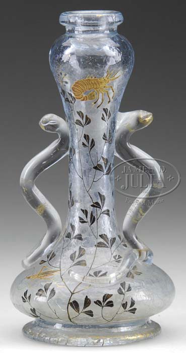 EARLY GALLE ENAMELED VASE. Truly outstanding early Galle vase is blown in crackle glass and is enameled with shaded brown leaves and stems extending from the foot up the neck. Vase is further decorated with an enameled and gilded bumblebee, enameled and gilded grasshopper and an enamel and gilded crayfish. Vase is finished with two applied stylized snake handles. Signed on the underside in red enamel “E. Galle Nancy”. SIZE: 8″ t. CONDITION: Very good to excellent with some light staining to the interior. 5-62619 (5,000-7,000)