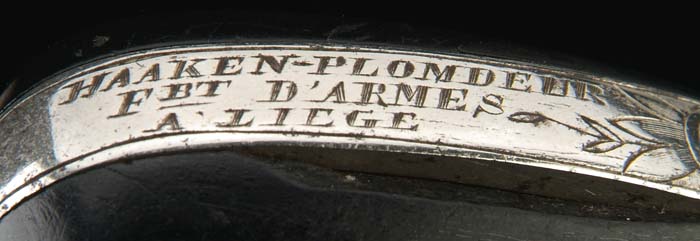 CASED MARIETTE PEPPERBOX. Cal. 46. NSN. 3-3/16” rnd Damascus bbls. Marked “MARIETTE / BREVETE” on front of grip strap and engraved “HAAKEN-PLOMDEUR / F BT D’ARMES / A LIEGE” on back grip strap. Entire pistol is nickel plated. Cased in a rosewood veneer case with German silver banding around the top and a German silver oval inlaid in the lid which is engraved with the initials “M.A.G.”. Maroon lined case has compartments for a combination bbl wrench, nipple wrench and bullet mold, plated brass cap tin, fluted powder flask, screwdriver, and some cast balls. CONDITION: Fine, with 90% nickel remaining, mixed with scattered spots of light surface rust. There is narrow sliver missing at rear of right grip. Mechanically fine. Case has several hairline cracks in veneer on top, otherwise good. Lining shows minor wear and staining. Locking stud has been replaced, and there is no key. 4-30494 FS80 (2,500-3,000)