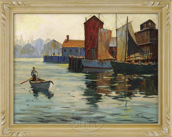J. J. ENWRIGHT (American, 1911-2001) “NEW ENGLAND DOCKS”. Oil on canvas New England harbor scene shows a man rowing a dory while standing in front of two docks with a green hulled fishing boat and blue hulled fishing boat. The docks have red and blue buildings with the city beyond. Signed lower right “J J Enwright”. Housed in its original carved wood frame. Titled and signed on reverse of stretcher. SIZE: 20″ x 26″. CONDITION: Light surface dirt, otherwise very good. 9-99422 (1,500-2,500)