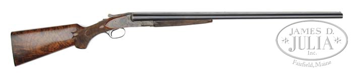 *ONE OF A KIND L C SMITH 16 GAUGE EXHIBITION GRADE SHOTGUN. SN FWE18150. Cal. 16 ga. 2-3/4″ Chambers. 28″ Barrels. Factory records indicate that this fine shotgun was originally produced as an “Ideal” grade, finished on August 4, 1947, and shipped to Bushnell & Wilson, returned to inventory Jan. 1, 1949, and delivered to Marlin on Feb. 18, 1949. The purchaser column in records is notated “Exhibition”. Aside from engraving and finish, all specifications match this gun. “Bill of sale” indicates that this gun was made as a “salesman sample” for Hunter Arms, and further states that Bob Wardsworth (father-in-law of seller) “got the gun back from sales staff after the company closed in 1945-50. The gun had remained in the family for 60 years.” This gun is also subject of long article in Spring 2011 DOUBLE GUN JOURNAL by Tom Archer, entitled “A Salesman’s Sample” giving a complete history and description, as well as showing numerous photographs. Bbls with raised, matted rib and two ivory beads, are stamped “L. C. SMITH – 16 GA – IDEAL – FULTON, N.Y. U.S.A.” on top of right bbl. Engine turned bbl flats are engraved with SN and “C”. Bottoms of bbls are stamped “LONDON STEEL”. Case hardened action is engraved with SN and “C” on water table, and features Hunter Arms selective “One Trigger”. Action is filed with very unusual and well done continuous bead at rear of fences and around top of action. Except for this unusual treatment, remainder of embellishment is standard “Crown” grade with scroll and rose highlights, and oval vignettes of dogs or game, on each lockplate; pair of setters on left, one with retrieved bird in mouth, right showing four ducks flying over marsh, with others in distant background. A gold crown is inlaid on pivot of top lever. Spectacular crotch figured American walnut full capped pistol grip buttstock measures 13-3/8″ over ribbed hard rubber buttplate. Checkering is unusual with leaf extensions and beads within borderless crenelated pattern which wraps over top of grip. Matching splinter ejector forend with triangular inset ebony tip, has nearly full coverage checkering. Bore diameter: left-.665, right -.664. Bore restrictions: left -.003, right -.022. Wall thickness: left -.036, right -.037. Drop at heel: 2-5/8″, drop at comb: 1-1/2″. Weight: 7 lbs. 2 oz. LOP: 13-3/8″. PROVENANCE: Letter from Cody Firearms Museum and another from L. C. Smith Collectors Assn with specs and what can be gleaned from the orig records concerned with this fine gun, along with orig bill of sale giving history of shotgun as known by consignor, and copy of DGJ with article. CONDITION: Excellent. Bbls retain nearly all of their orig blue. Orig case hardening color of action is slightly silvered and thinned on bottom, on fences, and on rear of lockplates, as well as thumbpiece of top lever, and rear tang, but overall is excellent. Trigger and safety button retain nearly all of their orig blue, slightly silvered. Trigger guard appears to have been re-blued, most likely by factory when it began to show wear. Stocks retain nearly all of their orig finish with a few minor marks, dulled a bit at grip and on forend from normal handling and use. Checkering is excellent, forend checkering slightly worn. Bores are excellent. Action is tight. Ejectors are very slightly out of time. Trigger works. A unique and exceptionally scarce L C Smith. 4-45185 MGM265 (50,000-60,000)