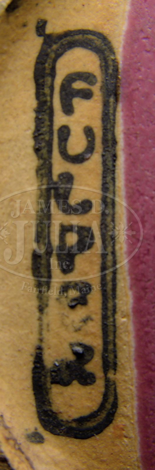 THREE FULPER PIECES. Lot consists of: 1) Fulper pottery vase with maroon glaze and double handles. Signed on the underside “Fulper”. 2) Fulper vase with maroon glaze shading to green at the top. The vase has four raised ribs extending vertically up the sides. Signed on the underside “Fulper”. 3) Fulper pitcher with maroon glaze shading to mottled blue and green at the top. Signed on the underside with impressed signature “Fulper 830L”. SIZE: Tallest: 8-1/2″ t. CONDITION: Very good to excellent. Pitcher has firing crack in the bottom interior. 5-67164 (500-700)