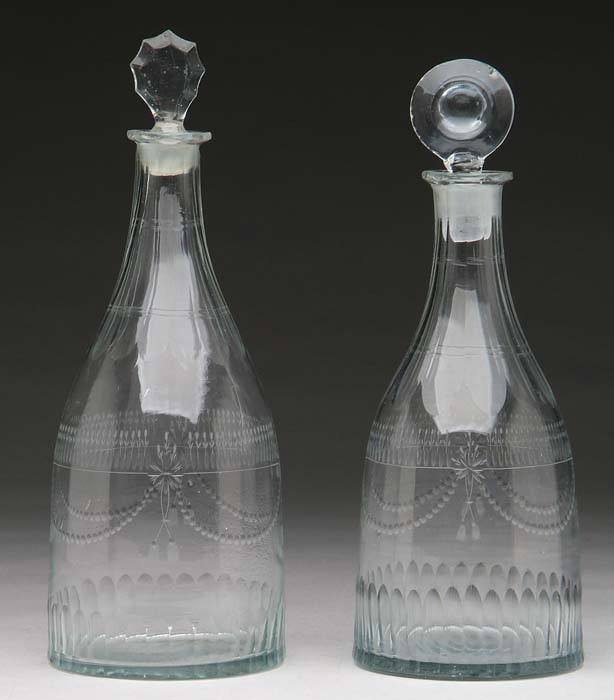 TWO EARLY BLOWN CLEAR GLASS DECANTERS. Similar designs of cut drapery and swag decoration. Each having a stopper. SIZE: 11” and 11-1/2”. CONDITION: Very good. 9-73140 (200-300)