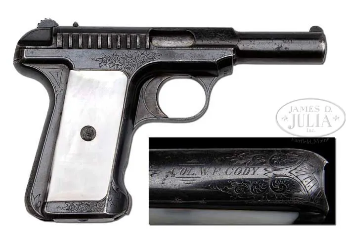 *TRULY UNIQUE AND IMPORTANT SAVAGE M1907 FACTORY ENGRAVED SEMI-AUTO PISTOL PRESENTED TO WILLIAM F. “BUFFALO BILL” CODY. SN 33177. Cal. 32 ACP. All blue finish with 3-3/4″ bbl, fixed sights and standard markings, mounted with smooth pearl grips that have the Savage Arms Co. logo in the center. Engraved on backstrap “Col. W.F. Cody”. Frame & slide are lightly engraved with foliate arabesque patterns with matching patterns on heel of backstrap. Accompanied by a letter from noted researcher & historian, R.L. Wilson, wherein he states that this pistol is pictured in color in his book The Peacemakers on p. 308. He also states that the majority of known Buffalo Bill guns are in museums, unavailable to collectors. Also included is a copy of a 1979 letter from Savage historian, Roe S. Clark, which states that the records show that this pistol was marked “SPEC GRADE”. It was accepted from the factory June 12, 1911 and shipped Aug. 22, 1911 to Col. W.F. Cody. Also included with that letter is a copy of the Savage record book for this pistol. Additionally included is a handwritten, signed & witnessed Bill of Sale dated 4/29/79 for this pistol, identified by SN, from someone named Greg Gurtis to Gene Schulze for the sum of $150.00. Also accompanying is a copy of a letter on Simpson Ltd. letterhead over the signature of Robert Simpson offering to loan this pistol to the Buffalo Bill Museum, Cody, WY, for a period of two years which apparently took place at some later date as there is also a letter from Paul Fees, Curator of the Buffalo Bill Museum, thanking Mr. Simpson for the loan. In Mr. Simpson’s letter he references the book 10 Quick Shots, Stern, which identifies this pistol by SN and relates details of the presentation. Also included is a copy of the July 1979 magazine Arms Gazette where on p. 25 this pistol is advertised for sale by Andy’s Pawn Shop of Ft. Smith, Arkansas. The above referenced receipt is apparently selling this pistol to Andy’s Pawn Shop. This is one of the most historically significant Savage pistols known with its presentation to Buffalo Bill Cody who later wrote a resounding endorsement of the Savage pistol which was probably the intent of the presentation all along. It is extremely rare that such a presentation can actually be documented from existing factory records. Buffalo Bill Cody was the first real true showman in the United States and was a brilliant entrepreneur and marketing genius. In addition his true wild west exploits from the time he was a mere teenager lends great mystique to anything associated with him. PROVENANCE: Wes Adams Estate Collection. CONDITION: Very fine. Overall retains 90-92% glossy orig blue with light muzzle edge wear and some fine pitting on bbl with another small area of pin prick pitting on front sides of frame. Grips are crisp with great fire. Mechanics are fine, bright shiny bore. 4-44745 LM357 (50,000-100,000)