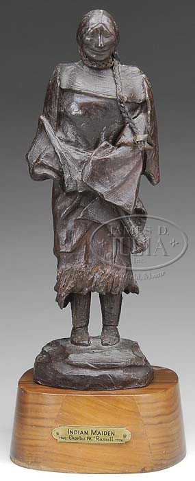 CHARLES MARION RUSSELL (American, 1864-1926) INDIAN MAIDEN. Later edition. Bronze shows a Native American woman with ponytails, dress, and robe. She stands on a simulated ground base. The piece is detached from a wood plinth having name & artist plaque. SIZE: Bronze: 12-1/2″ h. Base: 2-1/2″. PROVENANCE: From a coastal Connecticut home. CONDITION: Good. 9-23915 (400-600)