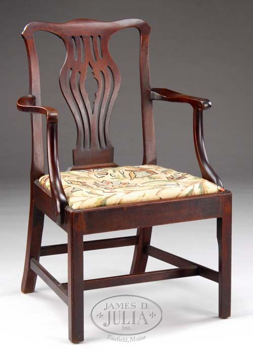 CHIPPENDALE MAHOGANY CARVED ARMCHAIR. Shaped crest and pierced back-splat. Crewel upholstery slip seat on square molded legs connected by an H-stretcher. Fourth quarter of the 18th Century. SIZE: 38” h x 17-1/2” seat rail. CONDITION: Old repairs to front legs at seat rail, otherwise very good. 9-74273 SM (500-750)