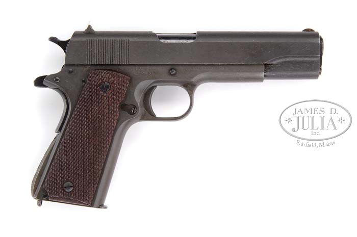 *FINE ORIGINAL COLT MODEL 1911A1 SEMI-AUTO PISTOL. SN 752364. Cal. 45 ACP. Usual configuration with 5″ all blue bbl, usual slide markings with “W.B.” (Col. Waldemar Broberg) inspector initials on left side above magazine release. Mounted with brown synthetic grips without interior reinforcements. Slide is matching numbered to the frame under the firing pin retainer. Accompanied by an all blue commercial magazine with marked base. Also accompanied by its orig greenish cosmoline paper. PROVENANCE: Carl Metz Estate Collection. CONDITION: New, unfired, still in the cosmoline. Retains 99.9% orig gray/green parkerized finish. Grips are equally new. Brilliant shiny bore, probably unfired. 4-39834 JR257 (2,000-3,000)