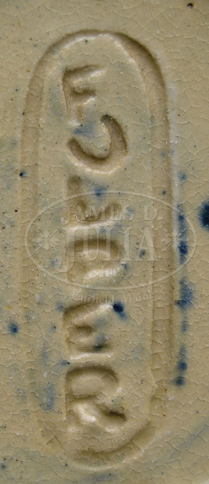 TWO FULPER VASES. 1) Fulper handled vase has striated blue glaze with green highlights. Marked on the underside with impressed signature “Fulper”. 2) Fulper two-handled vase has speckled green glaze and factory hole in the bottom for lamp base. Unsigned. SIZE: Tallest: 7-1/2″ t. CONDITION: Both very good to excellent. 5-67165 (300-500)