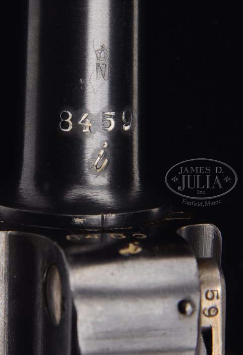 *RARE DWM I SERIES 1920 COMMERCIAL WITH GRIP SAFETY SOLD BY KREIGHOFF. SN 8459i. Cal. 30. 3-5/8″ bbl, dovetailed blade front sight, no markings over chamber and “DWM” marked toggle. Left side of frame is stamped “HEINRICH KREIGHOFF/WAFFENFABRIK/SUHL”. Safety lever is marked “GESISHERT” in bottom position. Front left side of frame is stamped with a horizontal Crown “N” proof and adjacent receiver is stamped with a vertical Crown “N” proof. There is a faint horizontal Crown “N” proof on left side of toggle. The “I” series of DWM’s between 2000-10,000 are known to be the range that Kreighoff sold. Checkered wooden grips and unnumbered wooden bottom mag. It was also made with rare grip safety and without a stock lug. All external numbered parts are matching. CONDITION: Very fine. Metal retains about 95% blue with faint sharp edgewear a small shallow area of surface oxidation on side plate. Strong straw colors thinning on take down lever and face of trigger, grips are sound with good checkering. Mechanics are crisp with a nice shiny bore. 4-38078 BDT241 (6,000-9,000)