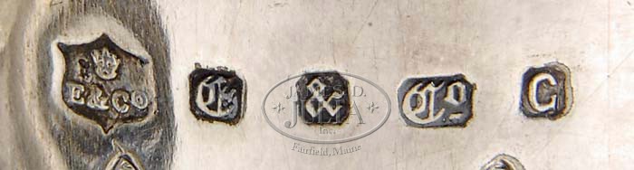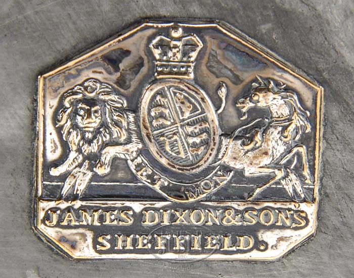 DIXON & SONS SHEFFIELD DECANTER STAND AND ELDER & CO. EWER. 2nd half 19th century. The Dixon Sheffield decanter stand fitted with three cut-glass matching decanters with stoppers, the stand with gadrooned scrolling edges, reticulated shaped sides and scrolled outswept feet, the ring handle cast with leaftips. Signed in two places beneath the base, the first an applied cartouche with opposing lions and stamped “JAMES DIXON & SONS SHEFFIELD”, the second a stamp “D*S” above the numeral 159. The ewer with flaring base and etched and frosted scrolling anthemion and tassel decorations, mounted with a silvered handle, collar and spout, having a domed hinged lid engraved with a dragon. Collar marked with hallmarks of Elder & Co., the date mark ca. 1859-1860. SIZE: First: 18-1/2″ h. Second: 11″ h. PROVENANCE: From an East Sangerville, Maine private collection, by descent from Dr. Samuel Cox Hooker (1864, Brenchley England -1935, Brooklyn Heights, New York), a sugar chemist, magician, and art collector, to the present owner, his great-grand-daughter. CONDITION: Decanter set in very good condition with no noted defects. Ewer with moderate foxing to glass, otherwise very good. 9-94960 (800-1,000)