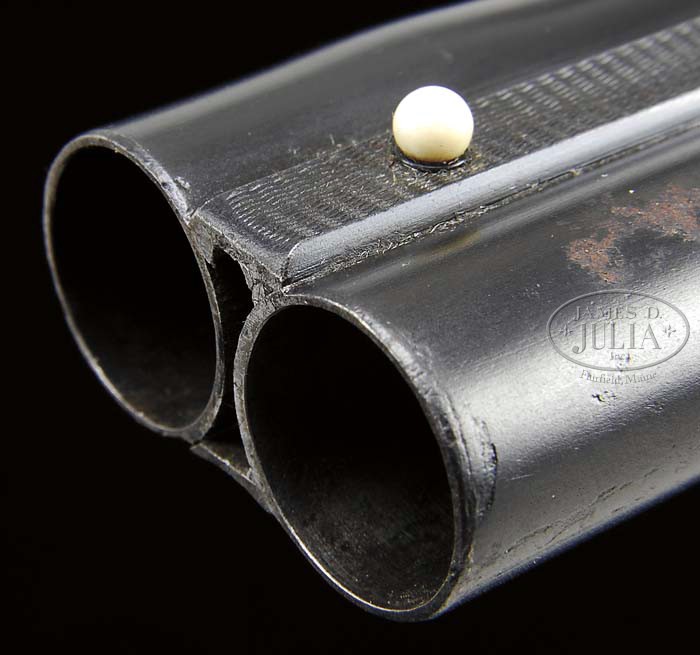 *SCARCE A. H. FOX XE GRADE 20 GA. SHOTGUN. SN 202079. (ca 1923) Cal. 20 ga. 26-1/2″ Chromox bbls are stamped with steel information and Fox Philadelphia address on top rear. Breech ends are engraved in typical XE style. Rib is mounted with two ivory beads. Bbl flats are stamped with SN, “Fox Proof”, and “X”. Small case hardened action is engraved in typical XE style with acanthus leaves outlining oval game scenes; ducks on left; quail on right, both surmounted by “Ansley H. Fox”. Bottom of action is the classic “high head” fox vignette. Action is fitted with Fox Kautzky single trigger with serrated selector button. “R” and “L” are inlaid in gold. Slightly mottled and lightly figured European walnut semi-pistol grip buttstock measures 14-1/8″ over leather faced open sided white line pad. Checkering is in typical XE style at grip and side panels. Long splinter ejector forend has inset ebony tip, and Fox Deeley latch release. Bore diameter: left -.620, right -.616. Bore restrictions: left -.012, right -.006. Wall thickness: left -.024, right -.024. Drop at heel: 2-5/16″, drop at comb: 1-7/16″. Weight: 6 lbs. 0 oz. LOP 14-1/8″. CONDITION: About good. This is an exceptional little gun with some major issues with the bbls, and in need of some TLC. Action retains 60 – 70% orig case hardening color, quite vibrant in protected areas, the balance silver brown. Stocks retain what appear to be most of their orig finish, but is possibly an old refinish of butt when recoil pad added. Checkering shows wear and has not been re-cut. Although bbls have excellent bright bores, they have been re-blued and front third exhibits considerable areas of deep pitting, and a .035 bulge in right bbl one inch back from muzzle, with a lifting of rib which is also partially detached toward breech. Muzzle keels are also missing. It’s possible that pitting would strike out and bulge would “tap down”, but this is most likely a candidate for sleeving or new bbls. Action is tight. Bbls are on face. Ejectors are slightly out of time. Trigger works. 4-45665 MGM5 (4,000-6,000)