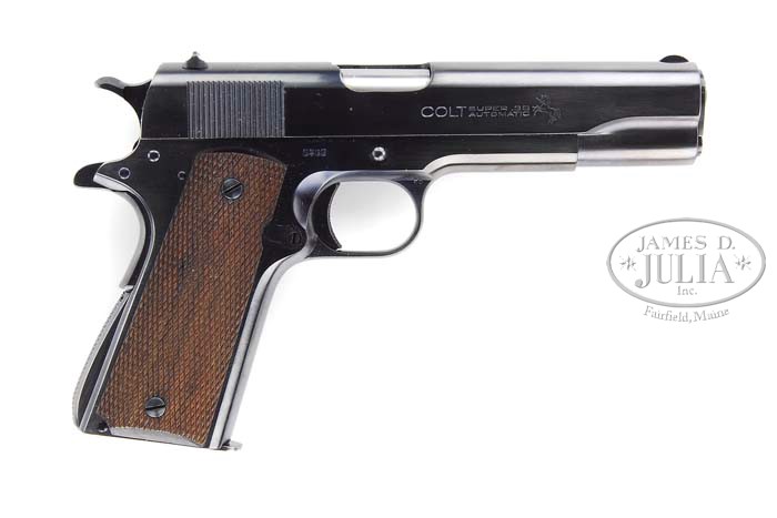*SCARCE PRE-WWII COLT SUPER 38 SEMI-AUTO PISTOL. SN 5433. Cal. 38 Super. Blue finish in usual Government model configuration with 5″ bbl, usual slide markings with fixed thick front sight and flat top rear sight. Serial number is on right side of frame behind slide lock pin hole. Mounted with full checkered walnut grips and accompanied by an orig 2-tone magazine with marked base. This pistol was completely and expertly restored by Turnbull Restorations to near perfect Colt specifications. Magazine, however, is in orig finish. CONDITION: Very fine. Completely & professionally restored as noted. Overall retains virtually all of this wonderful finish with no discernible flaws. Grips are equally new with very minor diamond point wear. Magazine retains about 95-96% orig factory finish. Mechanics are crisp, strong bright bore, frosty in grooves. 4-40111 JR260 (3,500-4,500)