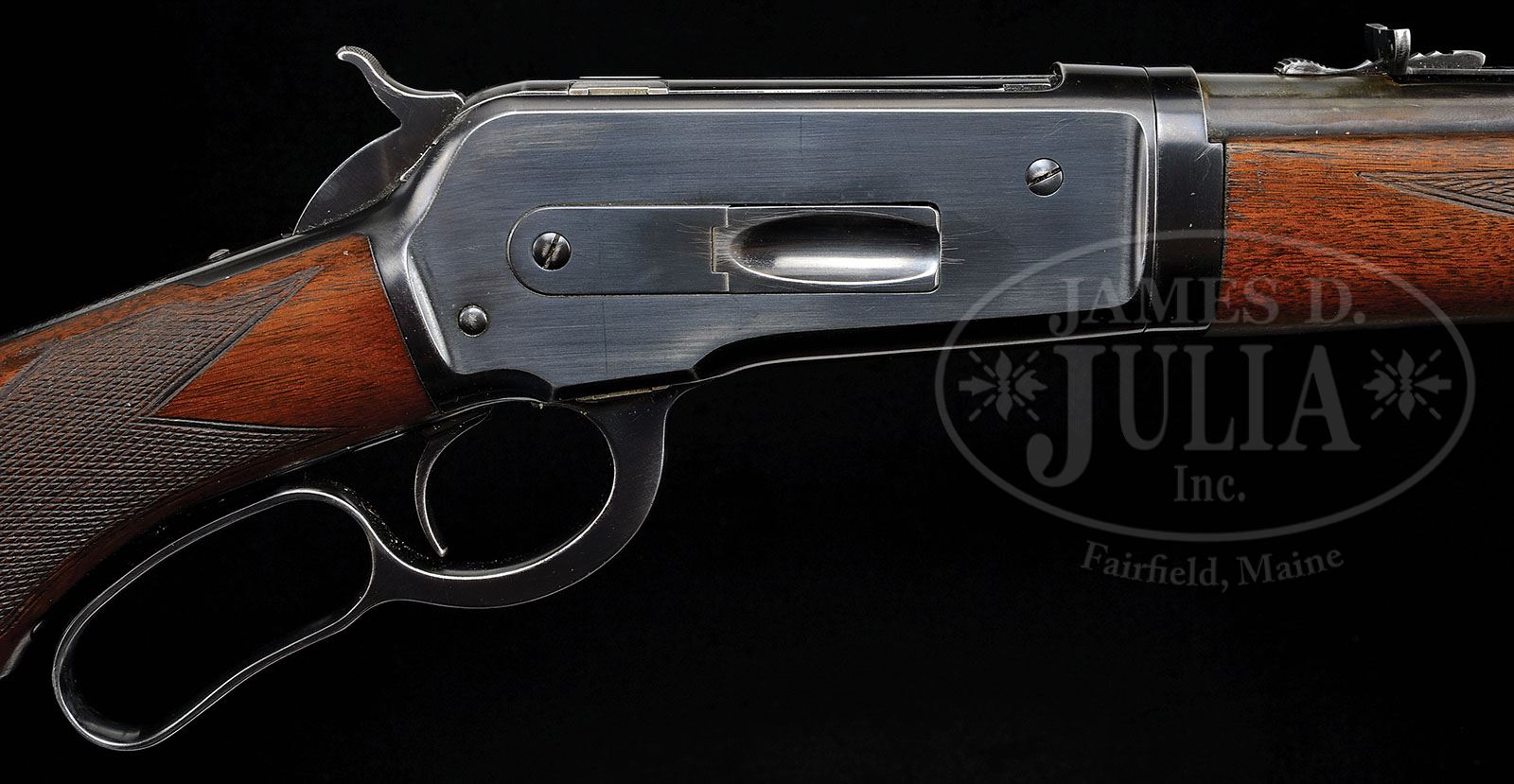*WINCHESTER MODEL 1886 DELUXE TAKEDOWN LEVER ACTION RIFLE. SN 154204. Cal. 33 WCF. Late special order deluxe rifle with 24″ tapered, rnd light-weight bbl, 2/3 magazine, ramp mounted Lyman ivory bead hunting front sight and flat top rear sight. Mounted with slab-sawed American walnut with H-style checkered forearm and capped pistol gripped stock that has Winchester hard rubber buttplate. Left side of lower tang, under the wood is marked with the assembly number “352”. Top tang channel of the buttstock has the assembly number “31”. CONDITION: Fine. Overall retains about all of a fine professionally restored finish to the receiver, forend cap, take down ring, lever & hammer. Bbl and magazine tube retain most of their fine restored finish with a wear spot over the chamber area. Wood is sound with a few light nicks and scratches and retains about all of an extremely fine professionally restored finish showing moderate diamond point wear. Mechanics are crisp. Strong bore with sharp rifling, dark in the grooves. 4-49730 JR423 (4,000-6,000)