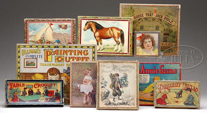 LOT OF 10 GAMES & PUZZLES. Lot consists of very early paper litho Nativity set with its original box (great graphics!), also Shepherd House that Jack Built game, Parker Brothers Little Ones puzzle, 3 small sets of German picture blocks, Milton Bradley Tiddledy Winks, table croquet, Little Orphan Annie game, and Ullman’s Painting Outfit. SIZE: Largest is 16″ l. x 12-1/2″ w. CONDITION: Vary from good to very good. 1-9209 (400-800) Auction: Advertising, Toy & Doll - Spring 2009 Please Note: All prices include the hammer price plus the buyer’s premium, which is paid by the buyer as part of the purchase price. The prices noted here after the auction are considered unofficial and do not become official until after the 46th day. |