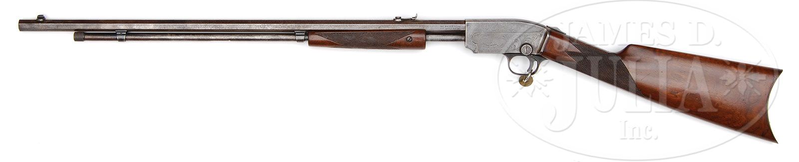 *FACTORY ENGRAVED MERIDEN MODEL 15 22 CALIBER RIFLE. SN 8133. Cal. 22. With orig sights, orig checkered deluxe grade stock and rifle butt. Gun features very nicely executed game scenes on both side of frame. Very attractive little gun. PROVENANCE: LeRoy Merz; Wes Adams Estate Collection. CONDITION: Very good condition. All metal clean and sharp with excellent marking, mostly a light gray patina color. Sharp checkering and excellent wood. Bore about good. 4-44853 LM72 (1,000-1,250)